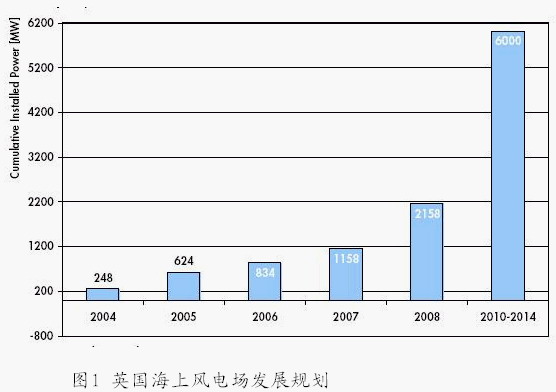 從圖1可以看出,英國在2006年海上風電場的規(guī)模將達到83.4萬千瓦,在2010年到2014年期間海上風電場的規(guī)模將達到600萬千瓦