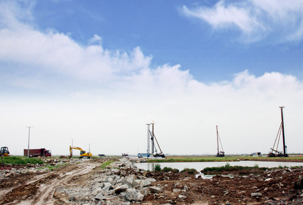 工程部徐經理介紹到,中復新水源徐圩項目是徐圩新區(qū)基礎建設工程,包括一個面積為139.7畝的水廠,一個面積為144畝的污水處理廠和外圍配套管網120公里,總工期14個月。項目部組建已經一個月了,項目前期建設事宜正在按計劃推進,專家隊伍、管理隊伍已經就位;樁基工程正在施工;土建工程已經發(fā)出招標公告;設備正在編制清單和技術規(guī)格書。項目地處徐圩鹽田,地質條件復雜,地表至負13米左右均為淤泥層,承載力差,累計要打下十萬多米的樁基。