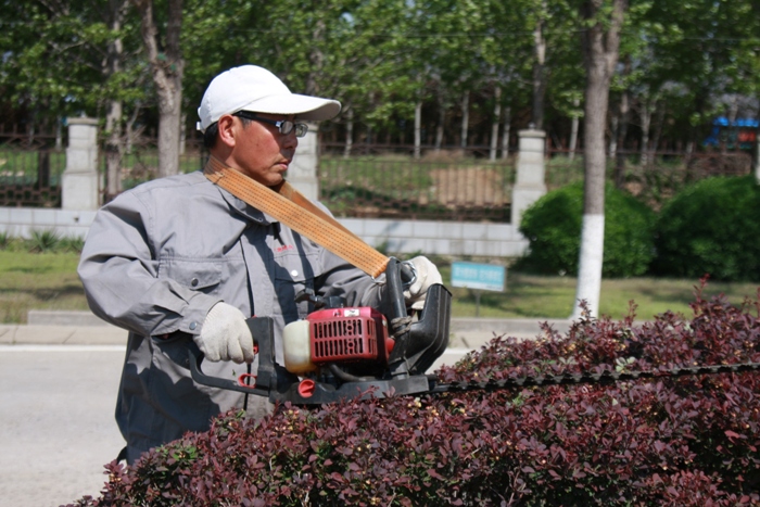 此時(shí)年近六旬的王昌嶺師傅正在給花木澆水,王師傅是園林綠化養(yǎng)護(hù)師,主要負(fù)責(zé)廠區(qū)內(nèi)花木的養(yǎng)護(hù)工作。因?yàn)閺S區(qū)取水點(diǎn)少,公司大面積的綠化區(qū)域要靠人工安裝水管澆水,有些偏遠(yuǎn)處水管接觸不到的只有通過(guò)水桶拎水,這在時(shí)間上花費(fèi)就比較長(zhǎng),無(wú)形當(dāng)中也增加了工作量,王師傅不急不緩的做著自己的工作。為了減輕師傅們的工作量,公司還多次組織員工在園區(qū)內(nèi)進(jìn)行除草、澆水活動(dòng)。