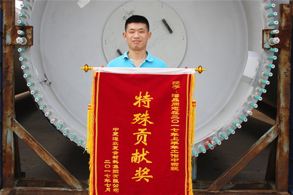 7月17日,周一早上八點(diǎn),這是中復(fù)連眾連云港葉片工廠各班組召開例行晨會的時間。機(jī)加工工段晨會最后一項議程,是一個簡單而隆重的表彰儀式,質(zhì)量總監(jiān)王利將一面“特殊貢獻(xiàn)獎”的錦旗頒發(fā)給了機(jī)加工成品10班班長潘晶。這錦旗背后,有著一個怎樣的故事?