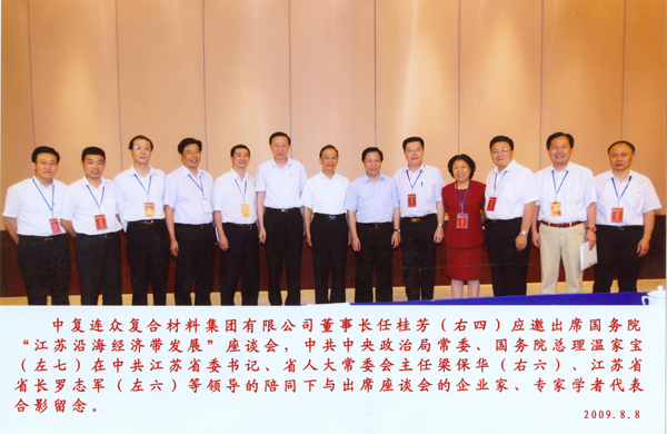 8月8日,中共中央政治局常委、國務(wù)院總理溫家寶在江蘇考察調(diào)研,并召開國務(wù)院“江蘇沿海經(jīng)濟(jì)帶發(fā)展”座談會,就江蘇沿海地區(qū)的經(jīng)濟(jì)發(fā)展廣泛聽取了連云港、鹽城、南通部分重點企業(yè)負(fù)責(zé)人和專家的意見。中國復(fù)合材料集團(tuán)有限公司副總經(jīng)理、連云港中復(fù)連眾復(fù)合材料集團(tuán)有限公司董事長任桂芳作為重點企業(yè)家代表應(yīng)邀出席,并合影留念。