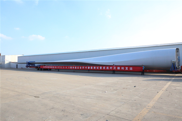 2018年7月20日,由中復(fù)連眾研發(fā)生產(chǎn)的LZ72.5-4.X海陸通用型風(fēng)機(jī)葉片順利通過全尺寸靜力測(cè)試,并完成首套樣機(jī)葉片發(fā)運(yùn)。該葉片的風(fēng)輪直徑148米,根部圓3200mm,葉片長(zhǎng)度72.5米,容量4.XMW,重量20.5噸。