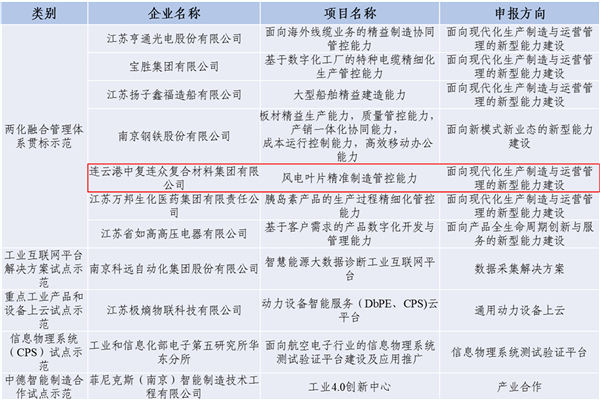 2018年8月10日,工信部公布了《2018年制造業(yè)與互聯(lián)網(wǎng)融合發(fā)展試點(diǎn)示范項(xiàng)目名單》,項(xiàng)目總計(jì)立項(xiàng)125個(gè),江蘇省11個(gè)項(xiàng)目入圍。其中,中復(fù)連眾所申報(bào)的“風(fēng)電葉片精益制造管控能力” 項(xiàng)目成功入選兩化融合管理體系貫標(biāo)示范項(xiàng)目。