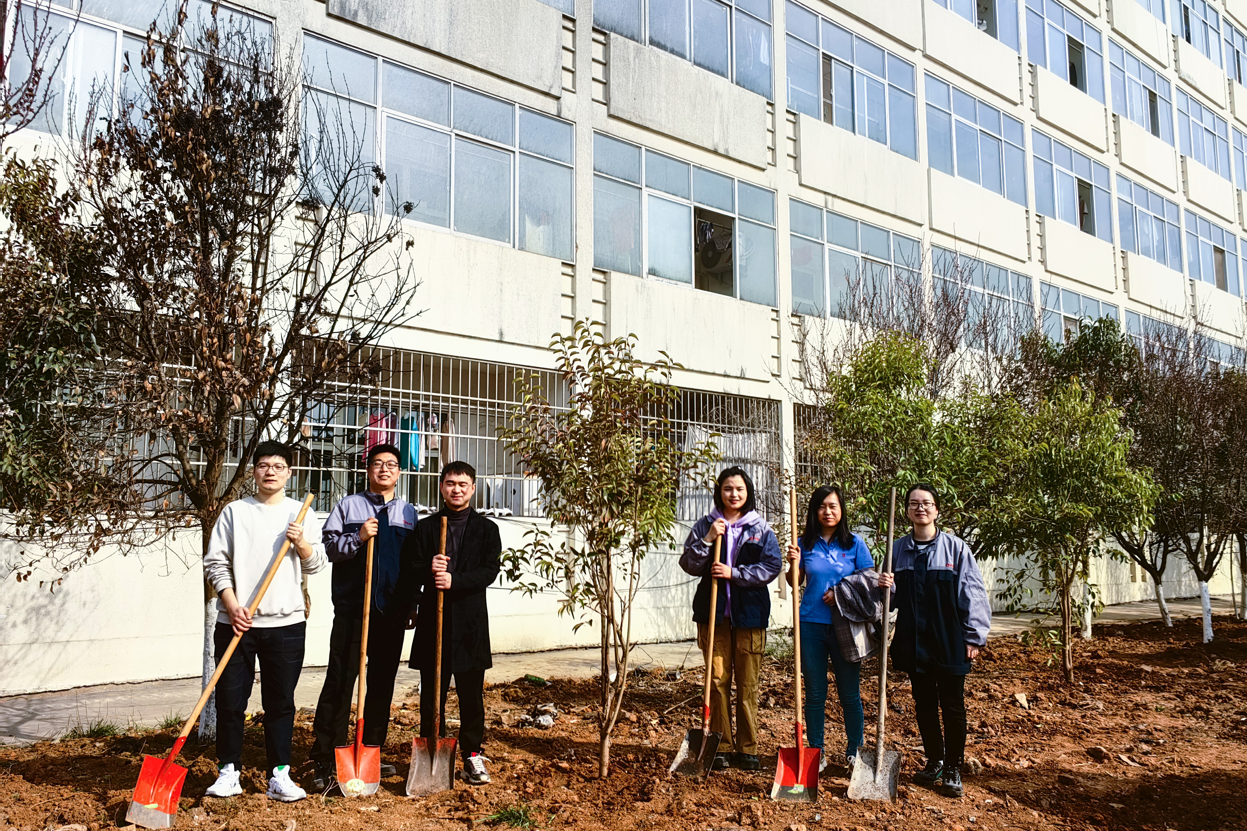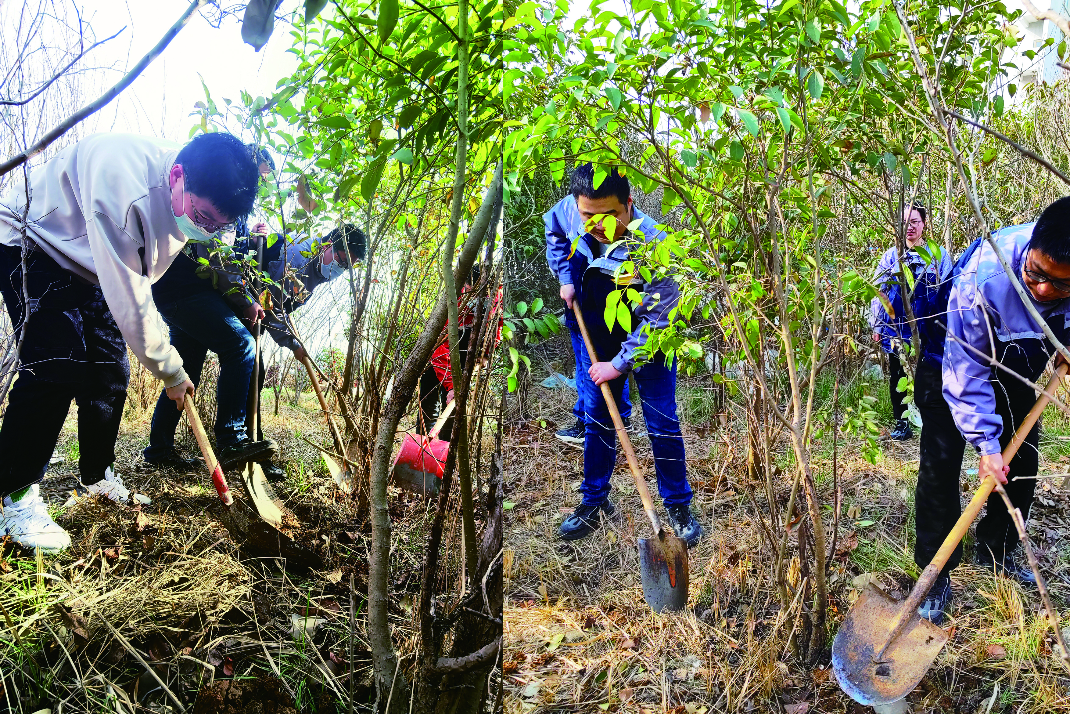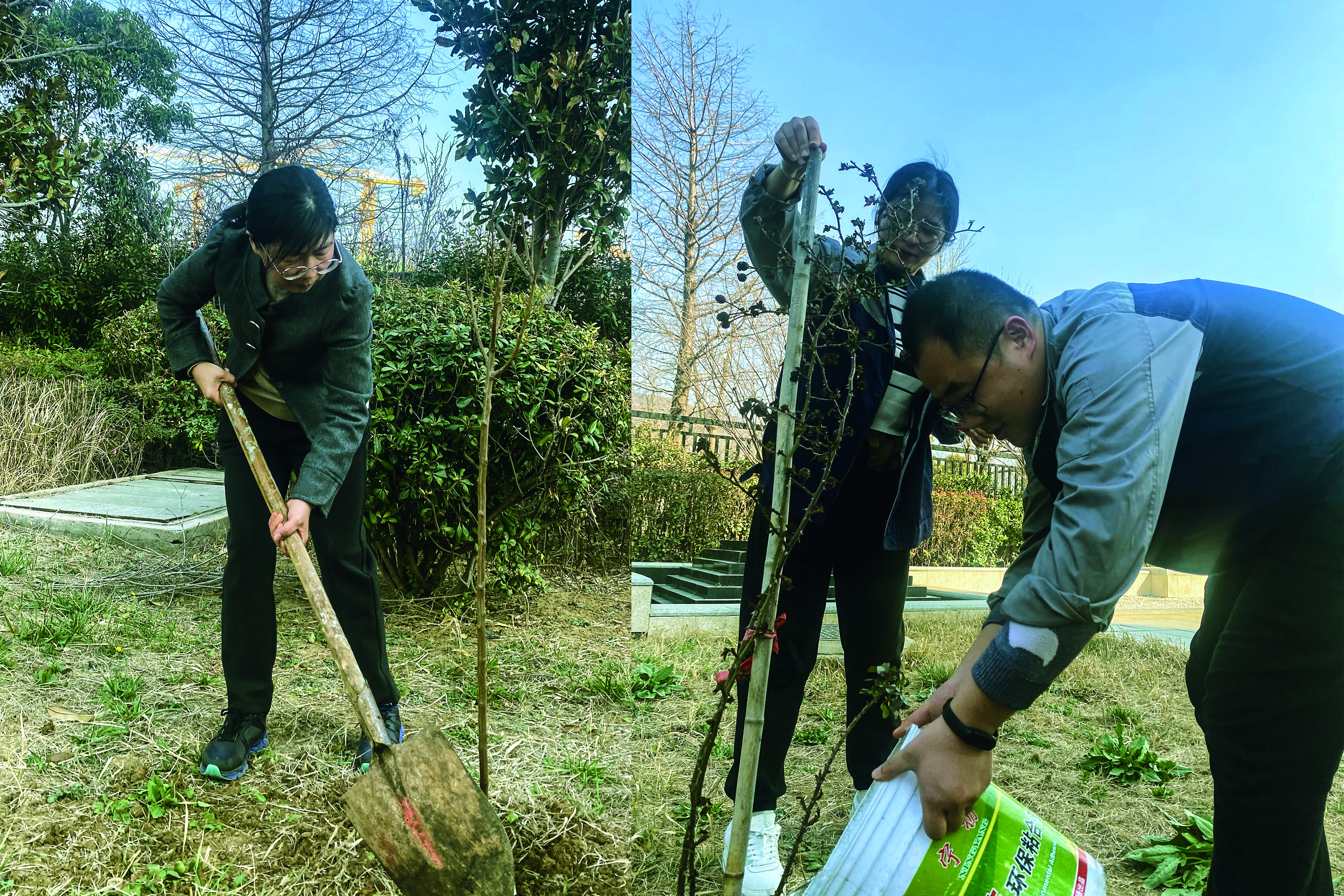 活動分別設(shè)在科研樓和連云港葉片工廠大浦工廠,科研樓現(xiàn)場主要是栽新苗增綠,大浦工廠現(xiàn)場主要是移苗護綠。在栽苗現(xiàn)場,大家手持鐵鏟、分工協(xié)作,有的揮鏟掘坑、有的扶苗校正、有的培土圍堰、有的提水澆灌……每個環(huán)節(jié)都井然有序,每道工序都認真細致、一絲不茍,確保栽一棵活一棵。在挖苗現(xiàn)場,大家在保護好樹苗根部的前提下將樹苗挖起,并借助工具車將樹苗移至新地栽種,集中力量對移植的樹木做好澆水定根工作,確保移一棵活一棵。本次活動大家相繼種下了大葉女貞、山楂、薔薇、月季等20余棵不同種類的苗木,青翠的樹苗在明媚的陽光中迎風(fēng)而立,展現(xiàn)出盎然生機和蓬勃活力。